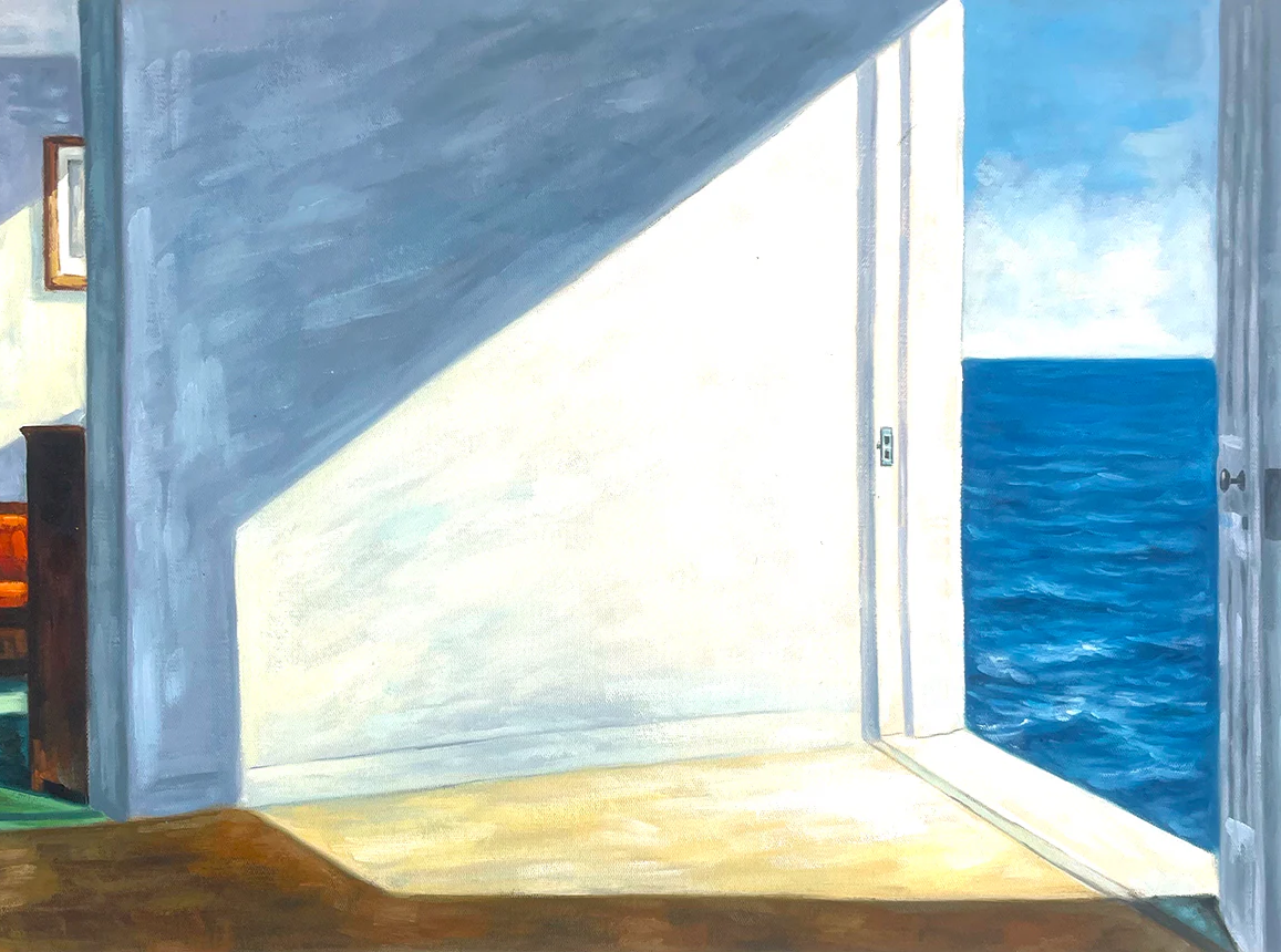 Additionally, I was inspired by Foxx’s use of paintings, contrasting the classical, brushstroke textures with modern graphic design sensibilities. This single artwork combined the paintings “A Monkey” by George Stubbs, “Rooms by the Sea” by Edward Hopper, and “Blue Painting” by Vasily Kandinsky.